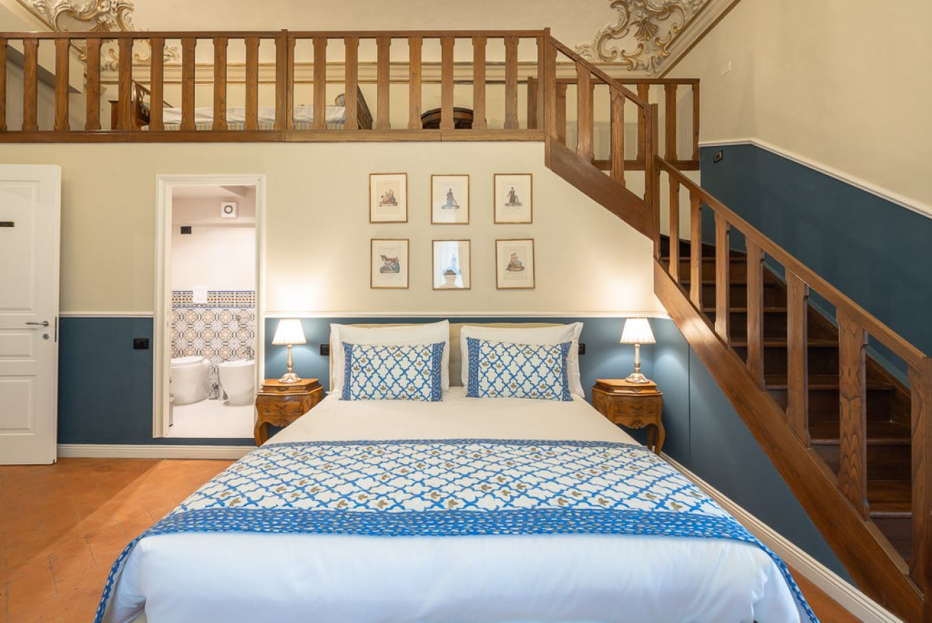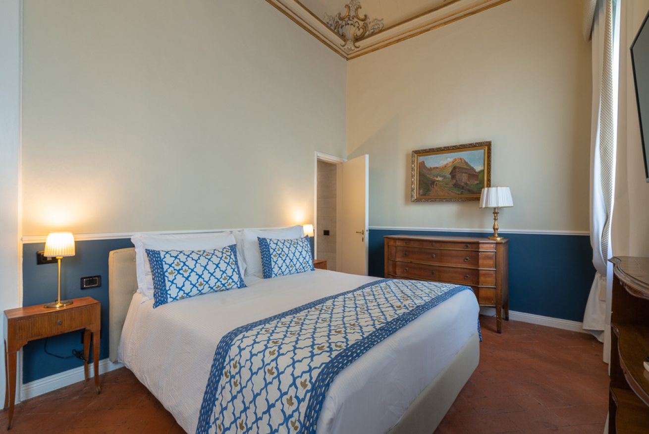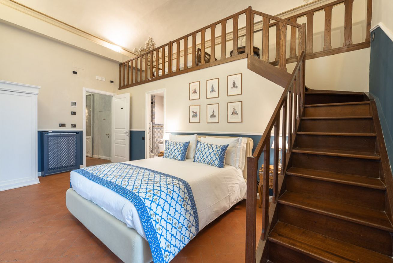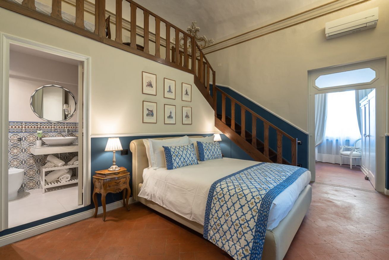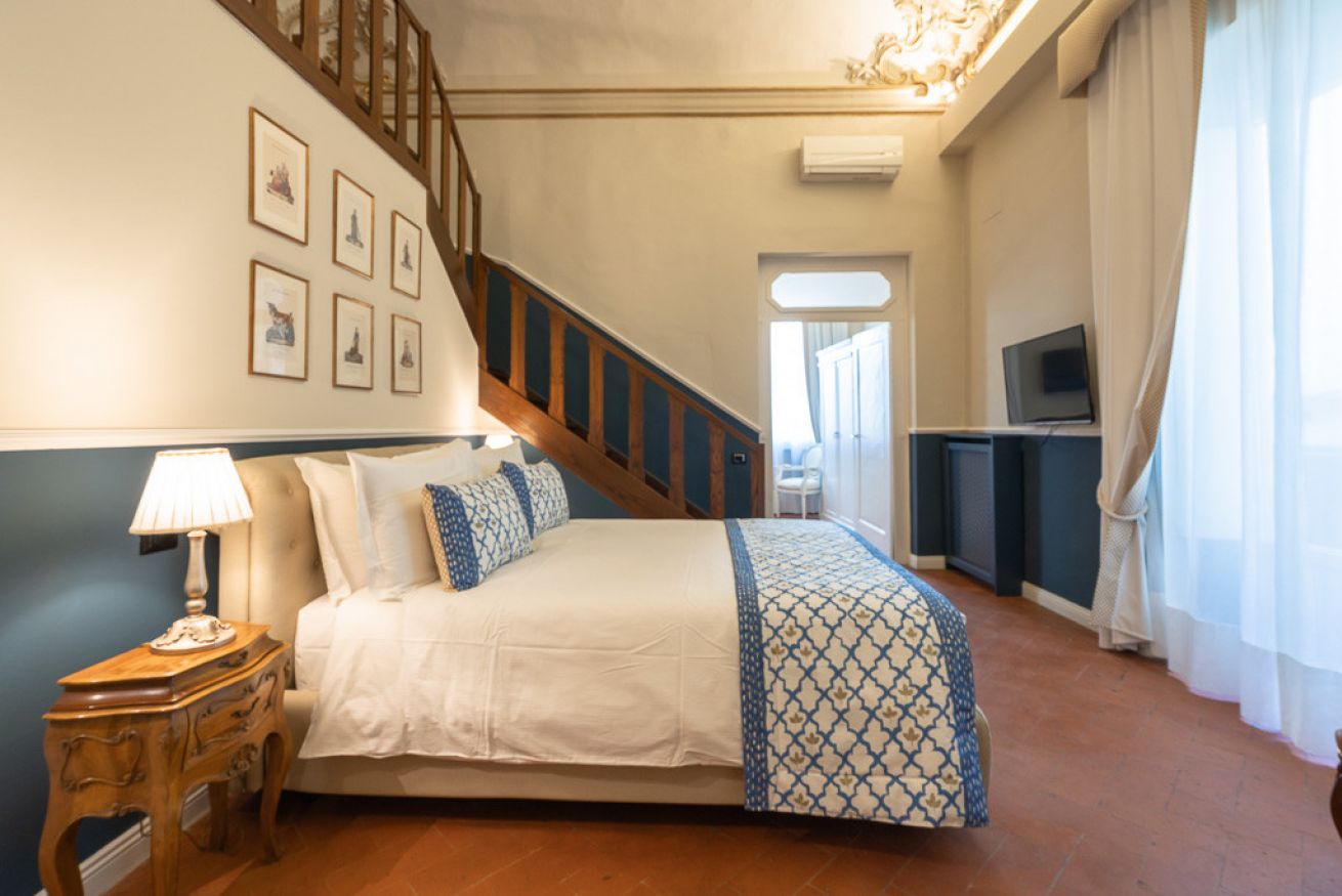 La camera Duomo rappresenta a pieno lo stile rinascimentale fiorentino grazie ai numerosi fregi che impreziosiscono il soffitto a volta ed all’imponente affresco risalente al 1700 che dona incredibile fascino al luogo. La stanza si sviluppa in due ambienti separati da una porta, ciascuno di essi dotato di bagno privato (in totale due bagni) ed una zona soppalco in cui è presente un letto extra che all’occorrenza può accogliere un ospite extra. Al suo interno è possibile usufruire di Tv a schermo piatto LCD, macchina da caffè Nespresso, minibar, phon e prodotti da bagno. I letti sono dotati di materasso matrimoniale con aggiunta di materasso “topper memory” che garantisce un riposo ancor più confortevole.