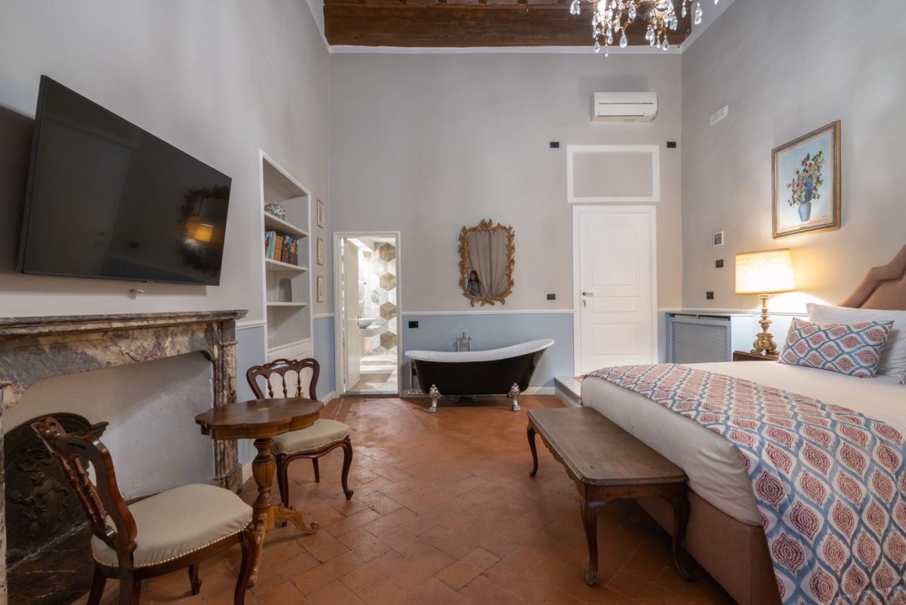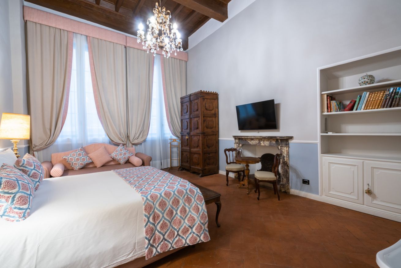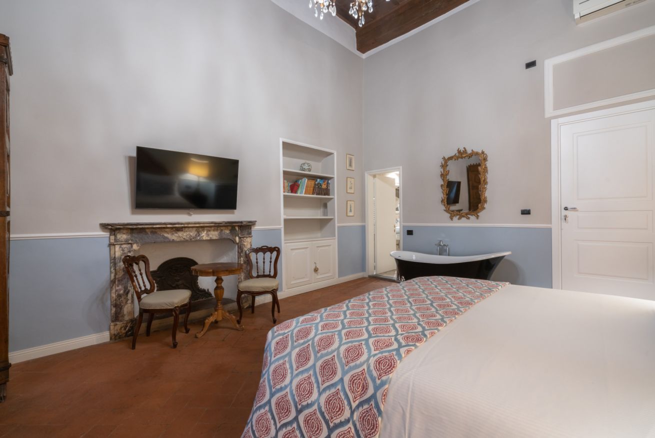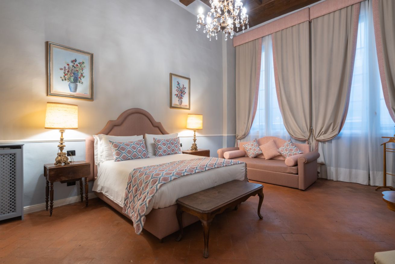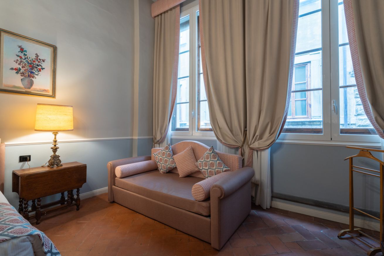 La camera Signoria ricrea lo stile tipicamente fiorentino grazie all’antico soffitto composto da travi a cassettone in legno, pavimento in cotto e grandi finestre che si affacciano sulla famosa Borgo Albizi. La stanza è dotata di tutti i comfort e dispone di bagno privato. Durante il soggiorno è possibile usufruire di Tv a schermo piatto LCD, macchina da caffè Nespresso, Minibar, Phon e prodotti da bagno. Il letto è dotato di materasso matrimoniale con aggiunta di materasso “topper memory” che garantisce un riposo ancor più confortevole. È possibile aggiungere un letto extra.