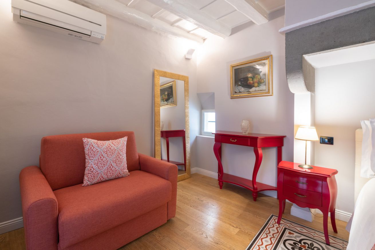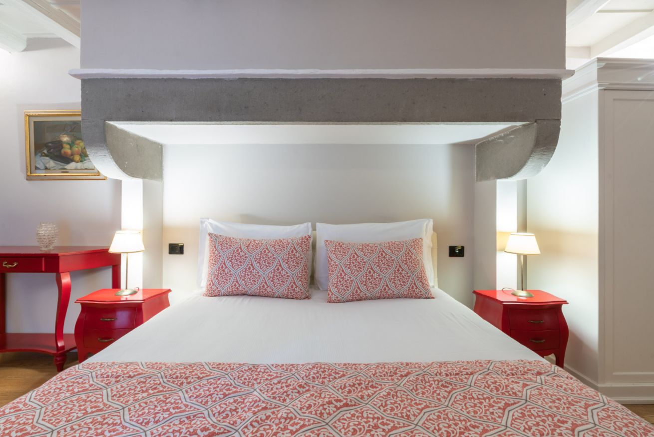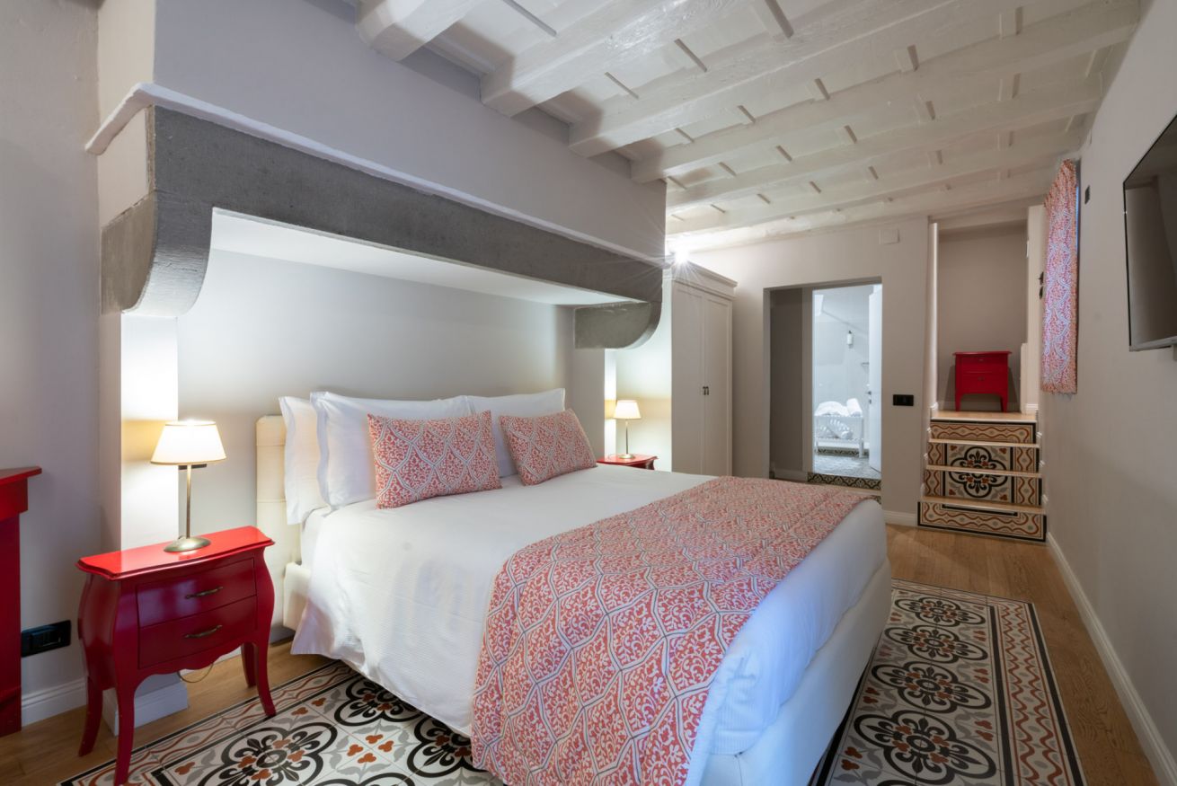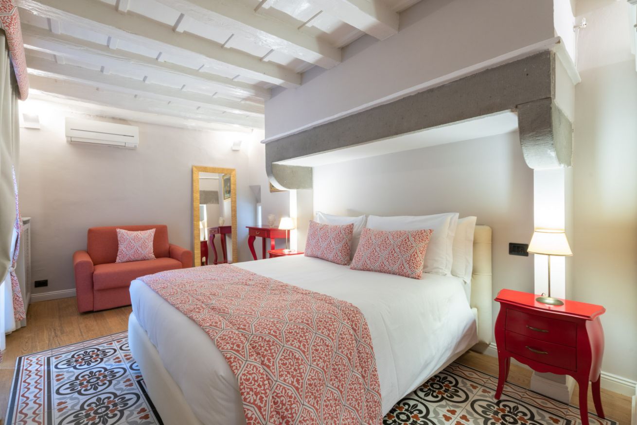 La camera Uffizi prende vita all’interno della antica cucina della dimora del cardinale. Il letto matrimoniale è incorniciato da una fornace del tempo realizzata in pietra che conferisce al luogo particolare fascino storico. La stanza è dotata di tutti i comfort e dispone di bagno privato. Durante il soggiorno è possibile usufruire di Tv a schermo piatto LCD, macchina da caffè Nespresso, Minibar, Phon e prodotti da bagno. Il letto è dotato di materasso matrimoniale con aggiunta di materasso “topper memory” che garantisce un riposo ancor più confortevole. È presente una poltrona letto che all’occorrenza può accogliere un ospite extra.